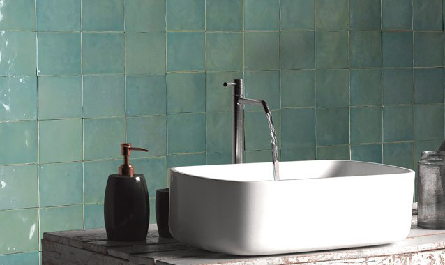 Türkisgrüne spanische Wandfliese der Serie Atlas im Format 10x10 cm. Die Fliesen sind leicht unregelmäßig hergestellt. Die Oberfläche ist leicht gewellt und glänzend.